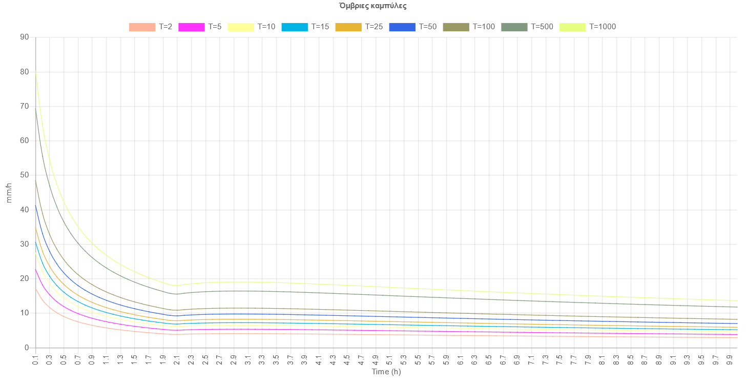 3. Από τα δεδομένα αυτά και με βάση τη μεθοδολογία που δίνεται σχεδιάζουμε στην επίσης ελεύθερη chart.js τις όμβριες καμπύλες: