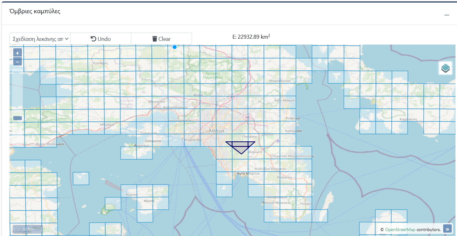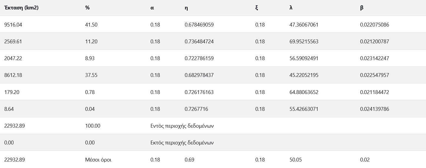 2. Με χρήση της javascript σχεδιάζουμε πολύγωνο που τέμνει τα πολύγωνα με τις παραμέτρους α,η,ξ,λ,β των ομβρίων καμπυλών και για κάθε ένα από αυτά υπολογίζεται η έκταση και το % του πολυγώνου που ανήκει σε κάθε περιοχή. Για τη γεωχωρική ανάλυση χρησιμοποιούμε την επίσης ελεύθερη turfjs.