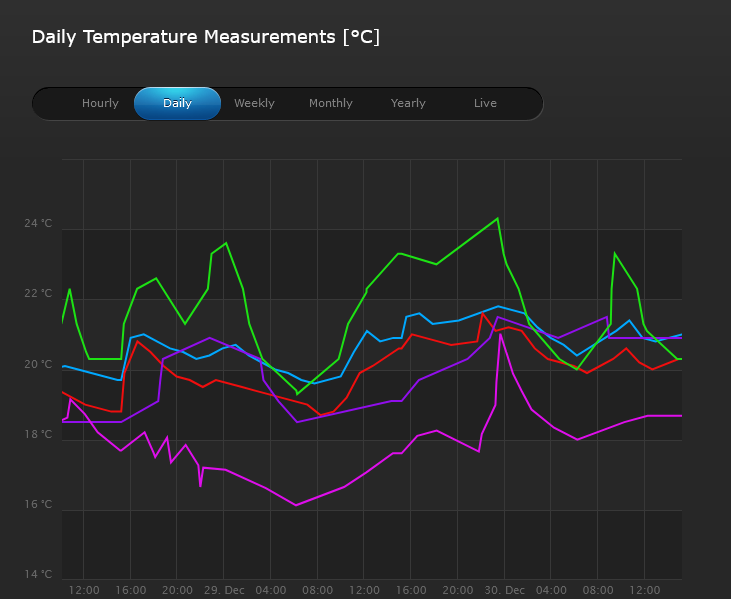 Το ίδιο σύστημα μπορεί να παρακολουθεί την εσωτερική θερμοκρασία στο ακίνητο σε ωριαία βάση ανά διακριτό χώρο και να λαμβάνει αποφάσεις με βάση εντολές. Κάτι τέτοιο είναι πολύ χρήσιμο στην περίπτωση που εφαρμόζεται θερμοστατικός έλεγχος σε επίπεδο δωματίου (πχ αντλία θερμότητας με θερμοστατικές βαλβίδες).