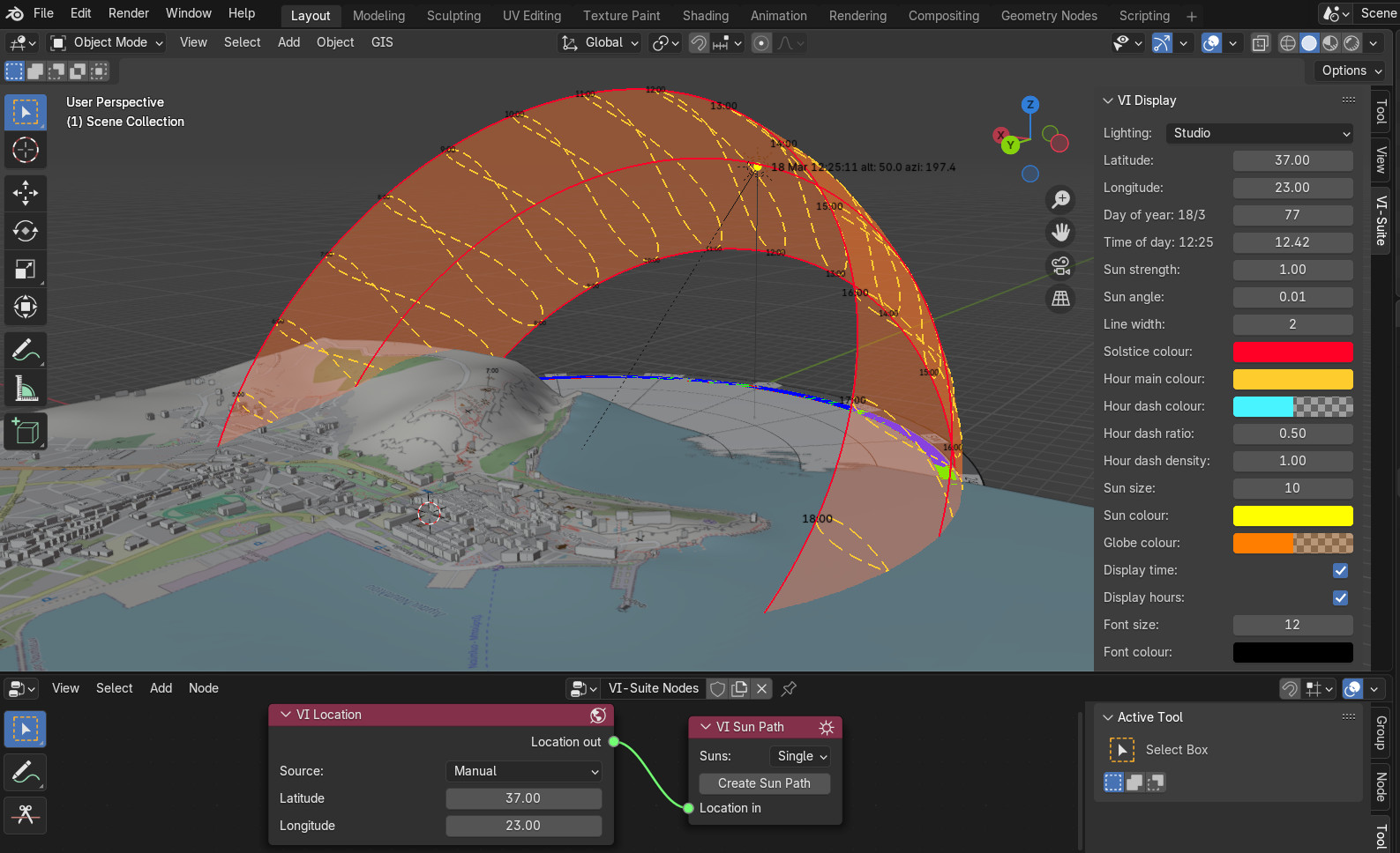 Με το πρόσθετο VI-Suite (διαθέσιμο εδώ - ελέγχθηκε οτι η έκδοση για blender 4.2 λειτουργεί και στην 4.3) μπορούμε να δημιουργήσουμε τρισδιάστατη ηλιακή τροχιά για περαιτέρω ανάλυση (σκίαση, ηλιακά κέρδη κ.α).